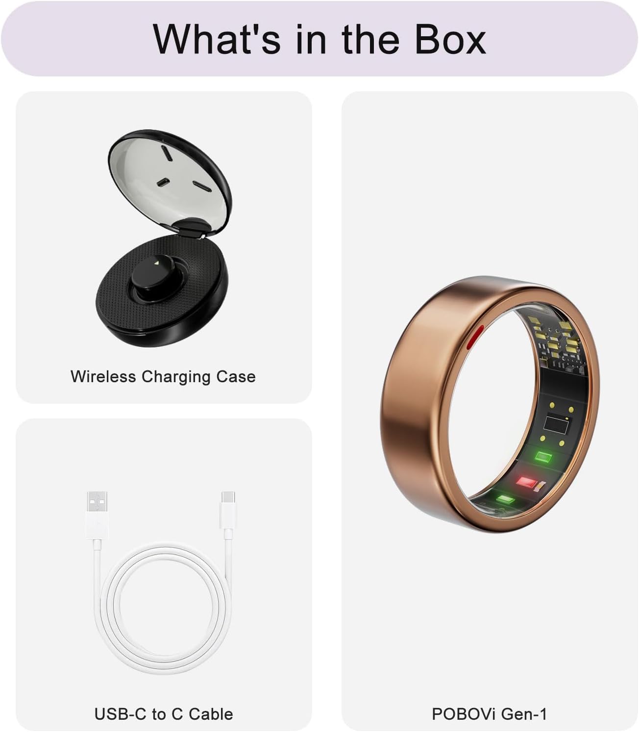 [What’s in the Box] POBOVi Smart Ring Gen 1*1, Wireless Charging Case*1, 1m/3.3ft USB-C Cable*1, Instruction Manual*1 and Quick Guide*1