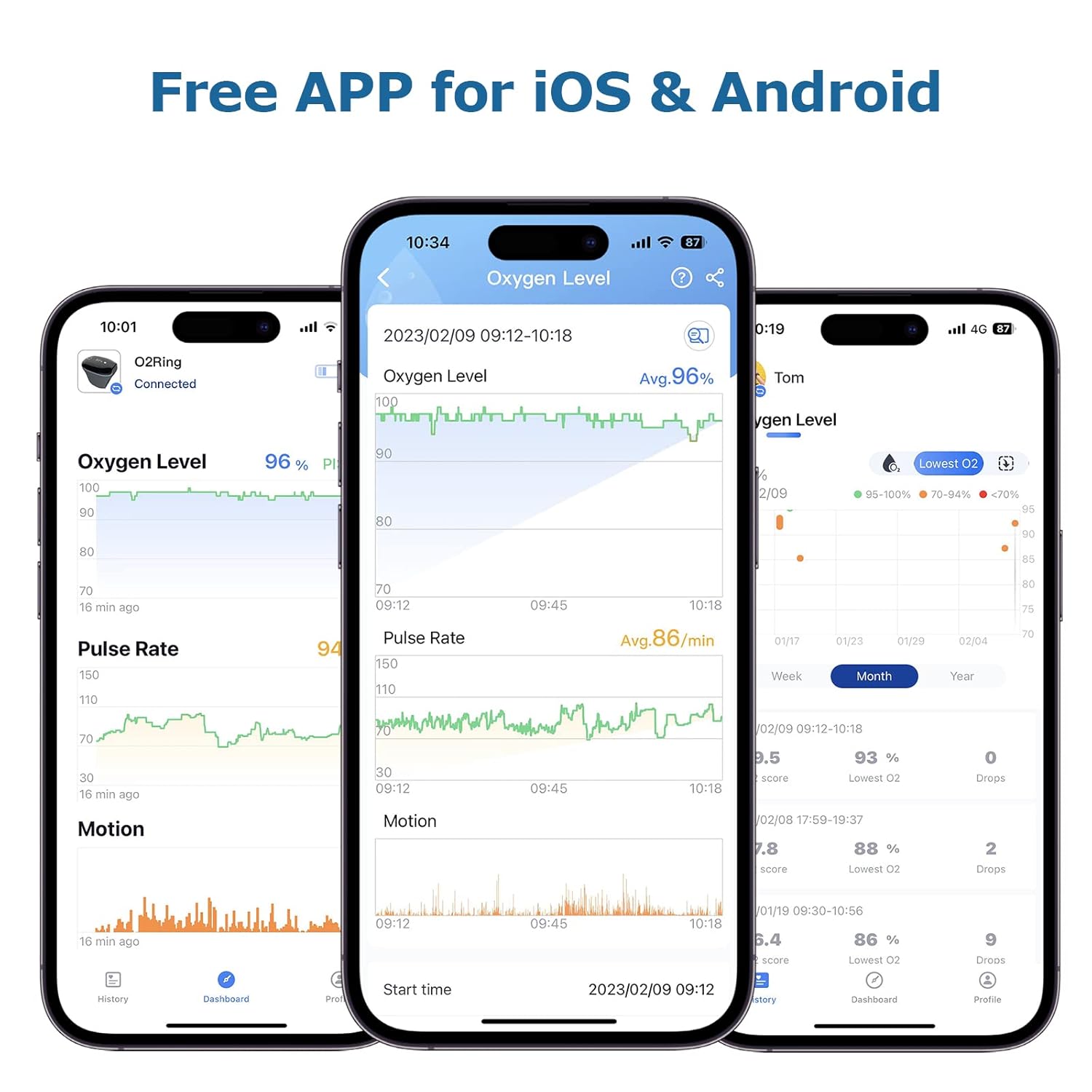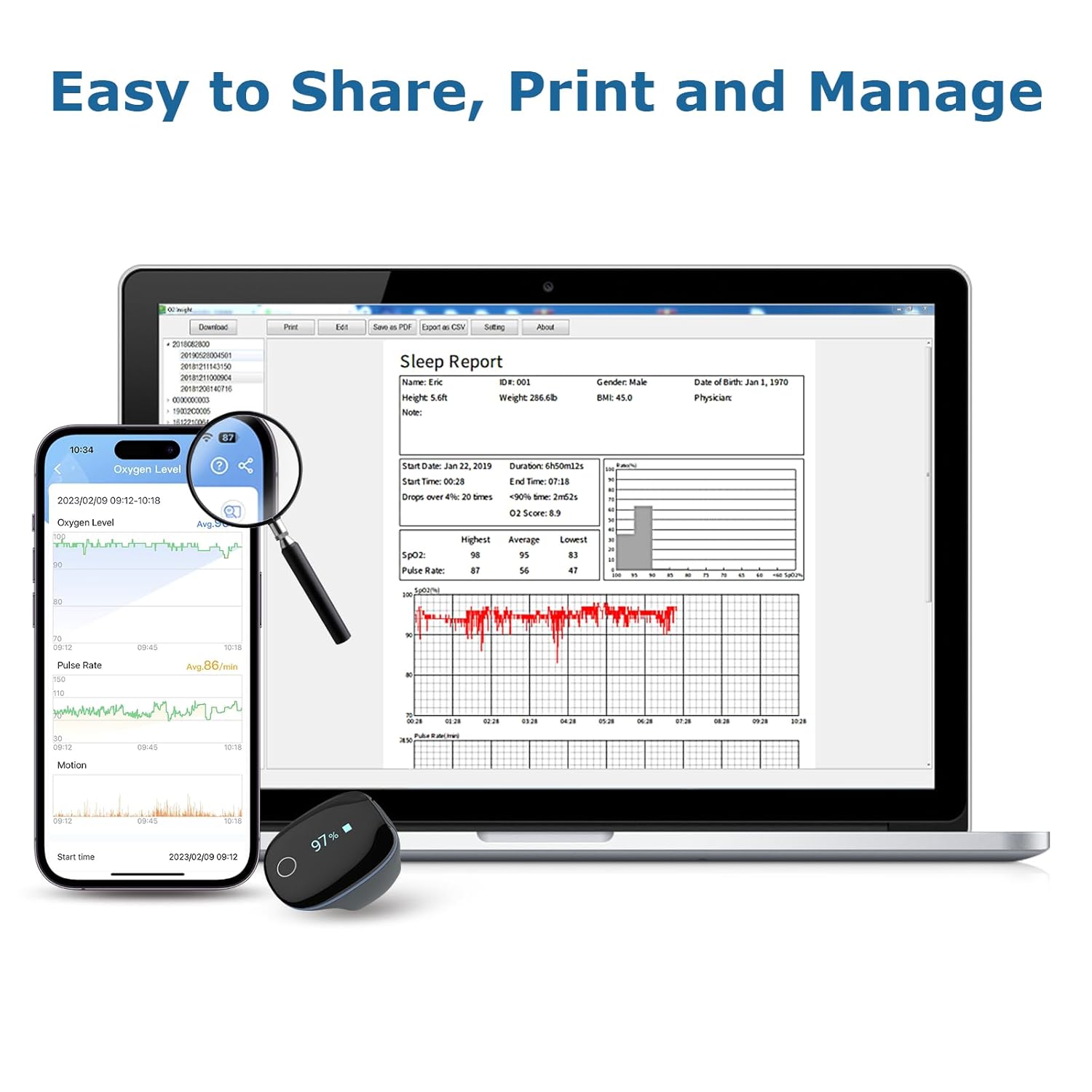 Detailed APP & PC Reports: Free APP & PC software provides graphic O2, PR report and trends of data. Unlimited sharing of PDF and CSV reports. APP compatible with iOS 9.0 or above, iPhone 4s/ iPad 3 or above, Android 5.0 or above, with Bluetooth 4.0 BLE.