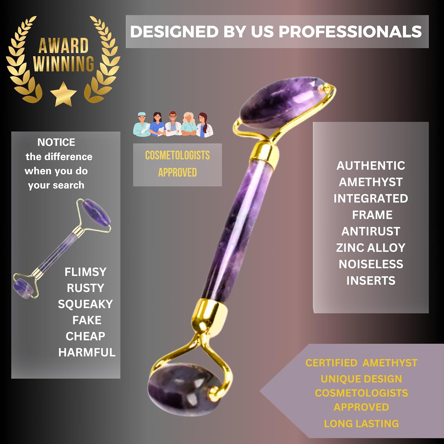 Bonus Amethyst Guasha & Jade Roller – Noisless & Smooth USA Quality : We’ve seen those Jade Rollers too, you know the ones that squeak and break. This, is not those.But we use a hard, stainless steel integrated frame (all one piece) and two tiny “wheels” that we insert in the head of the roller which turns your roller smoothly and without a noice..