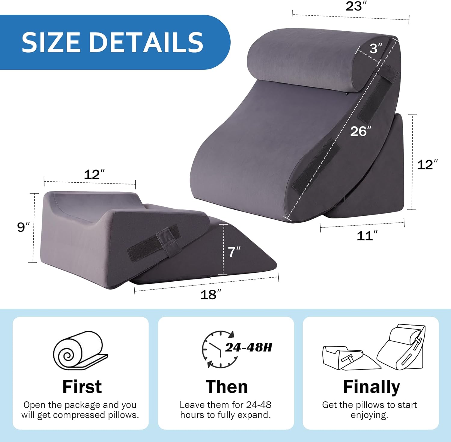 【Warm Tips】The pillow wedges for sleeping surgery are vacuum-packed for optimal shipping. Please allow 24-48 hours for them to fully expand after unpacking to enjoy optimal support and comfort. Then rest easy with our orthopedic wedge pillows