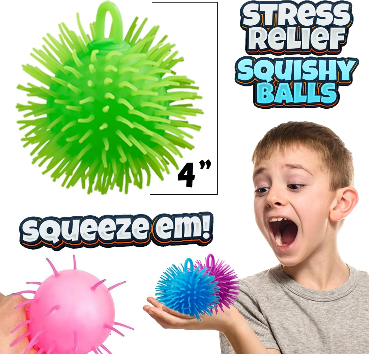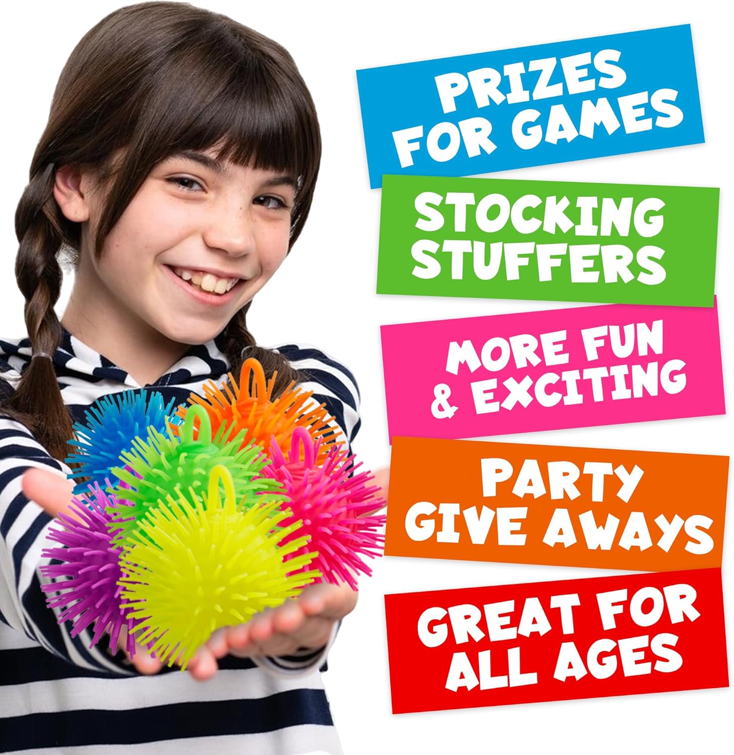 Pack of 12 Boxes – 144 PUFFER BALLS: Each bulk pack of puffer balls for kids includes a total of 12 large stress relief squishy ball toys made of thick rubber and in assorted neon colors including: orange, blue, green, purple, yellow, and pink. You can hold, throw, toss, squeeze and pull them for endless hours of fun and enjoyment