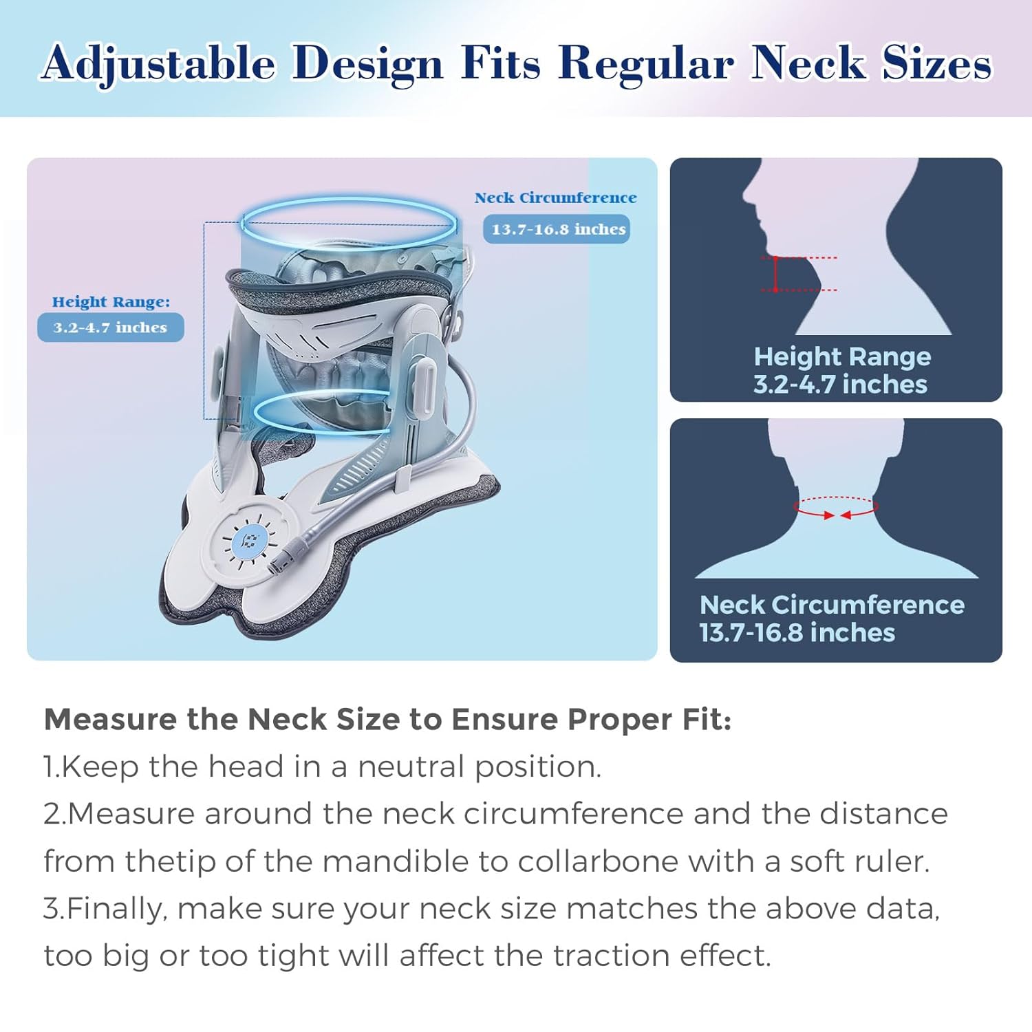 【Synchronized Traction & Easy Adjustment】: Neck Height: 3.2-4.7 inches, Neck Girth: 13.7-17.5 inches. Rotate the knobs on both sides of the knob 180 degrees counterclockwise, and the jaw drag and air column will simultaneously push up the cervical spine while locking the cervical spine posture, realizing the recovery of the “c” curvature.