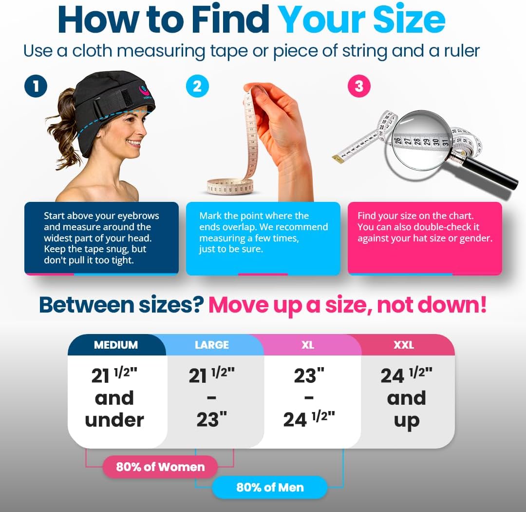 SIZING GUIDE: This is a fitted cooling cap that works best when sized properly — so be sure to consult the sizing guide in the image gallery or our Store page to get the right sized cap. If between sizes, move up a size because the adjustable straps will help you tighten the migraine cold cap — and trust that, . Consult the sizing chart to find your size, and get ready to experience the relief of scalp cooling with Icekap.