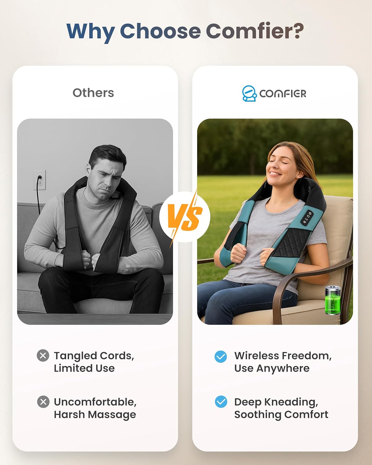 【Cordless & Rechargeble—Massage Anywhere】This wireless and rechargeable neck & shoulder massager is equipped with a 2200mAh battery, delivering up to 1 hour of cordless relaxation after just 4 hours of USB-C charging. Weighing only 2.9 lbs, it’s ultra-lightweight and portable—perfect for travel, office breaks, or relaxing at home. Enjoy deep relief from cordless massager wherever you go, without being tied to an outlet.