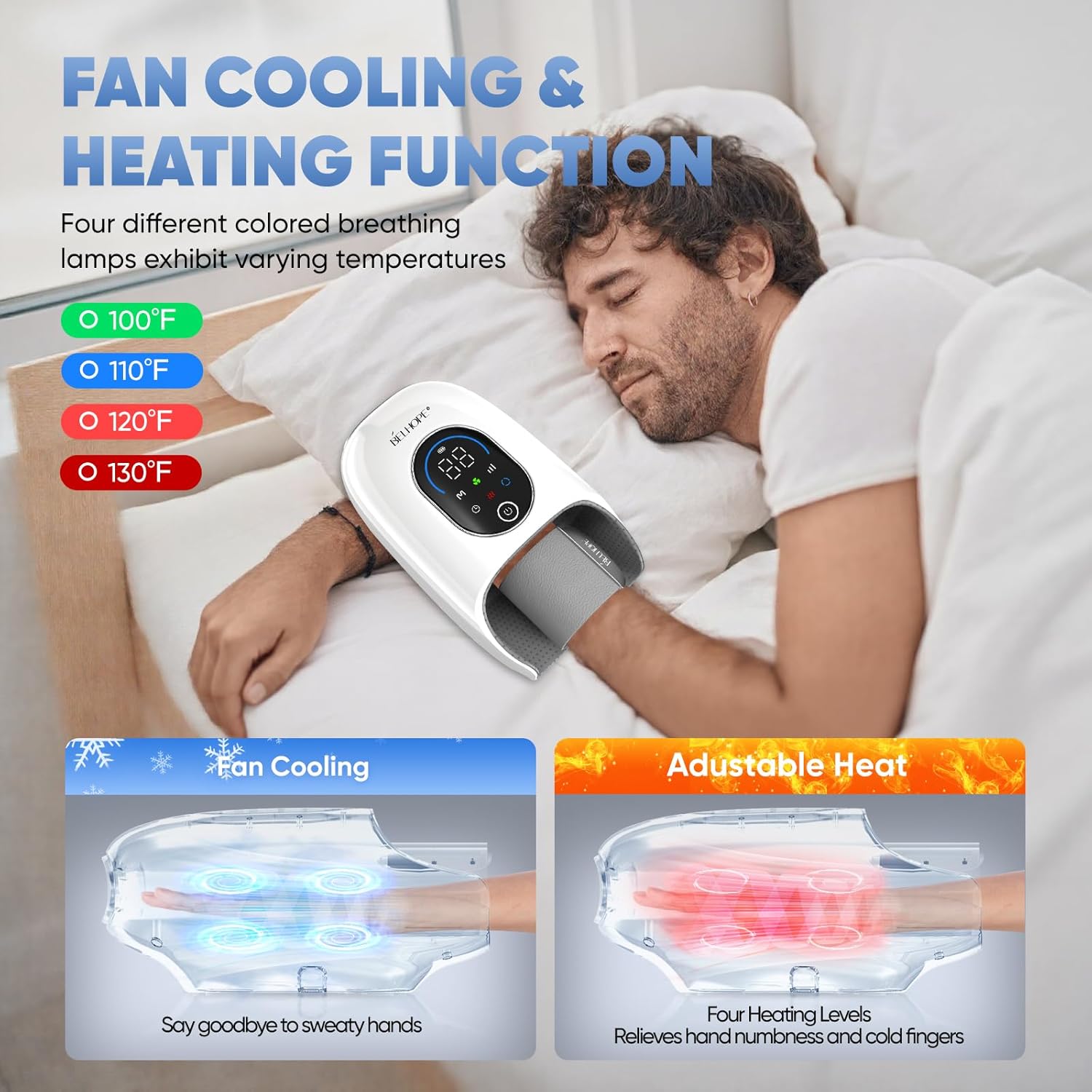 Innovative Cooling Fan: Experience relief from hand fatigue with our hand massage device that includes a powerful cooling fan. This feature not only relaxes muscles but also helps maintain a comfortable temperature, reducing discomfort caused by excessive heat and eliminating sweaty palms.
