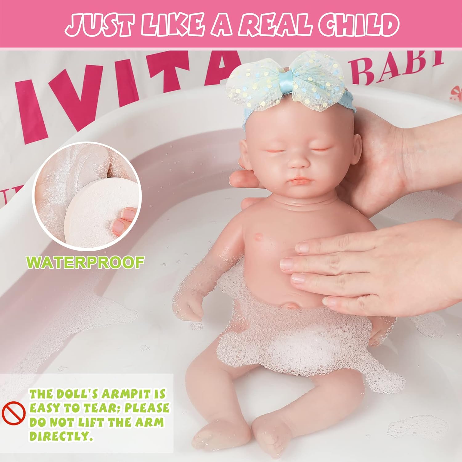 Unlike vinyl dolls and stuffed cotton dolls, our dolls have a solid silicone body, so you can bathe them without worrying about damaging them. Please use warm water, wipe gently with a cotton cloth, and ensure not to scrub hard to avoid hurting the skin.
