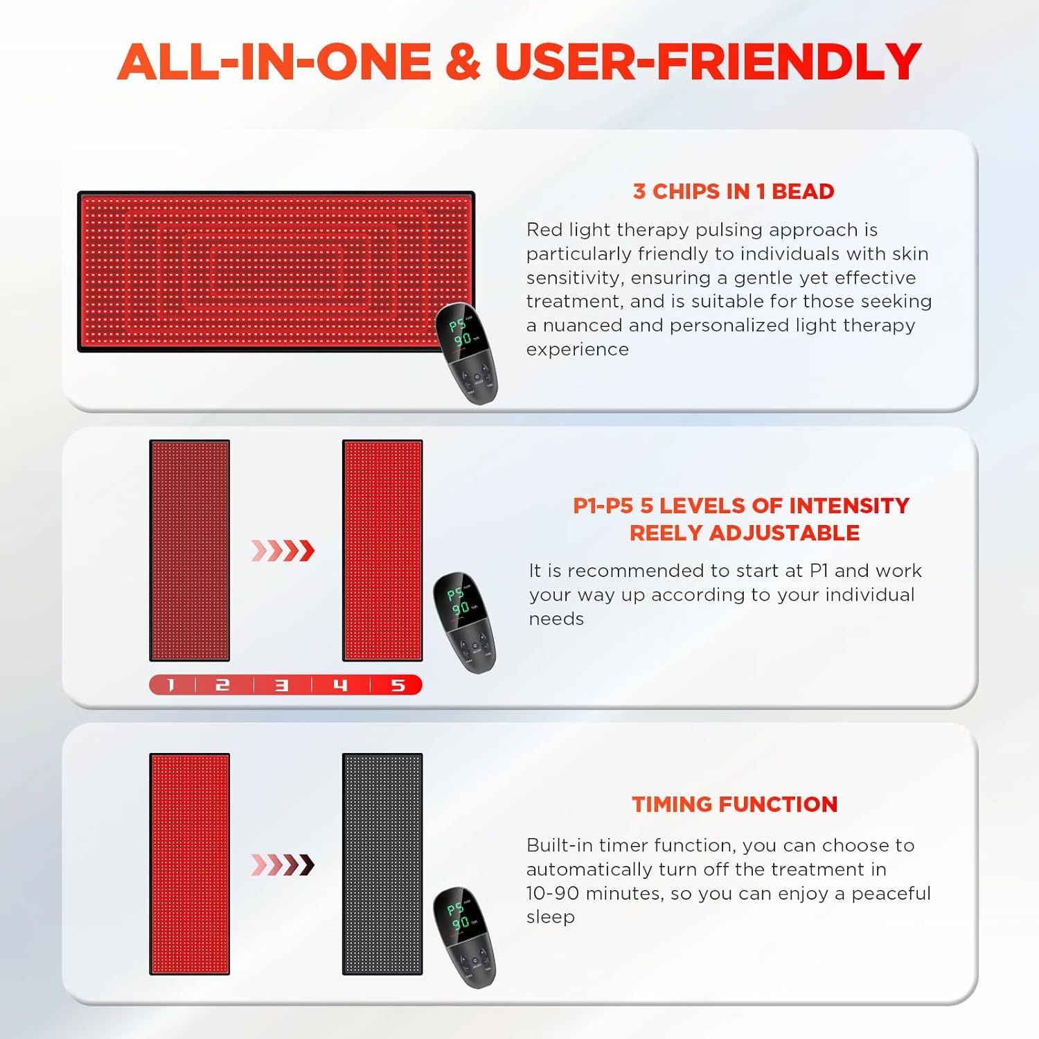 TIMER & BRIGHTNESS EASY TO USE: Effortlessly manage your red light therapy mat with timer & brightness controls. Customize session duration (10-90 mins) and tailor intensity (30W-125W) using P1-P5 adjustments. Elevate well-being with precise settings—a user-friendly boost to your self-care routine