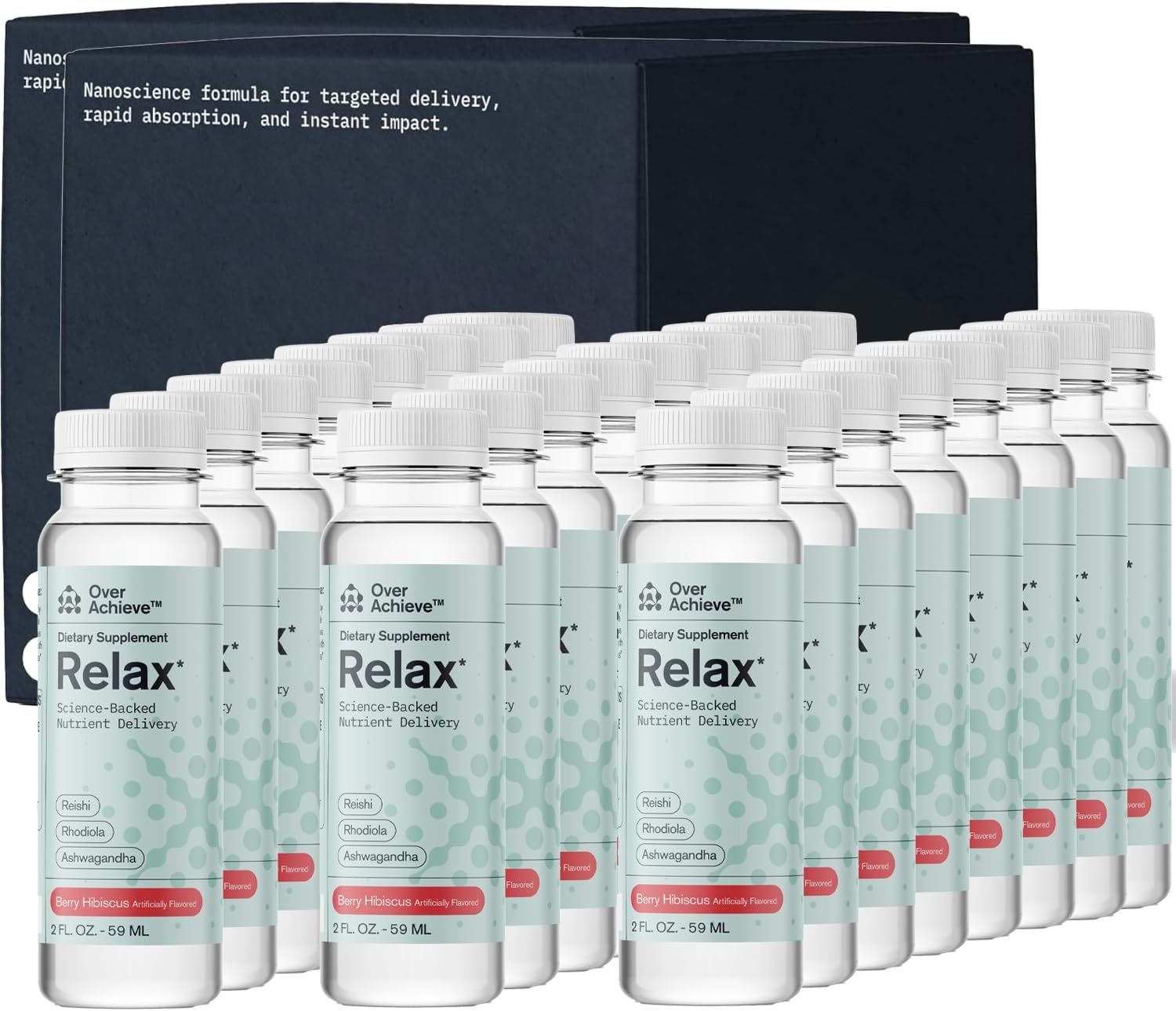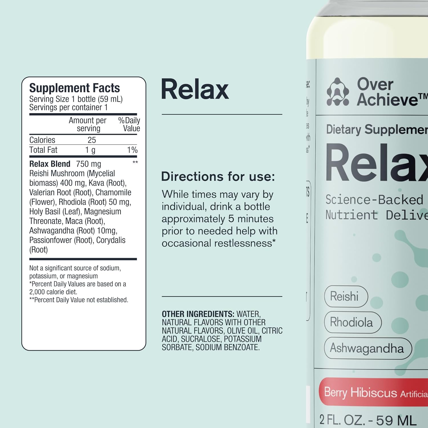 Relax Drink for Relaxation and Stress Relief, Contains Ashwagandha, Rhodiola Rosea and Reishi Mushroom with Advanced Nanoscience Technology, 24 Pack Calm Nervous System Berry Hibiscus, 2oz