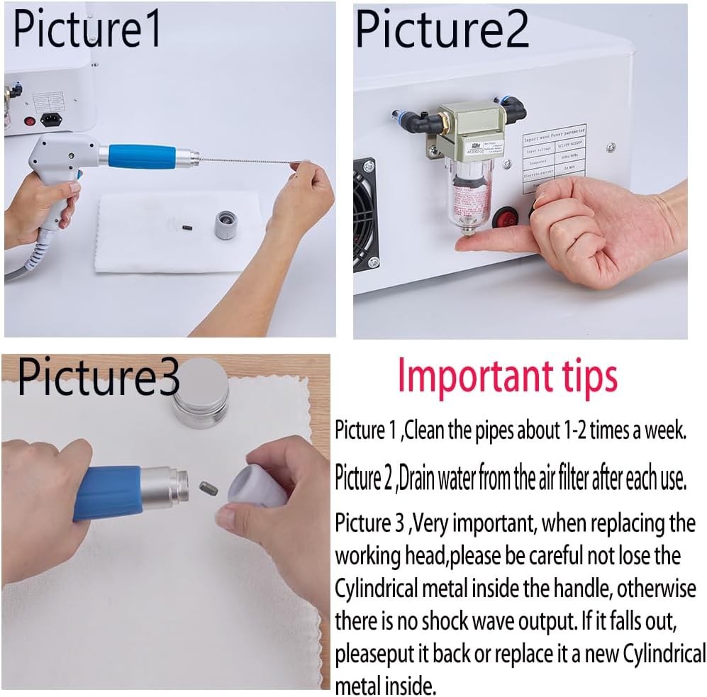Notes:After received the machine, connect the handle to the machine then turn it on for use. When replacing the working head, not let the cylindrical metal block in the handle fall out. If it falls out, please put it back. If it is lost, take a spare one from the case and place it in the tube of the handle.When cleaning the inner tube of the handle, remove the head of the handle, take out the cylindrical metal block in the handle tube, clean the inner tube of the handle with a brush,drop 1-2 drops of sewing machine oil on the metal block. the machine will go through a certain period of reliability testing before leaving factory,so it is a normal state small water remains in the air filter