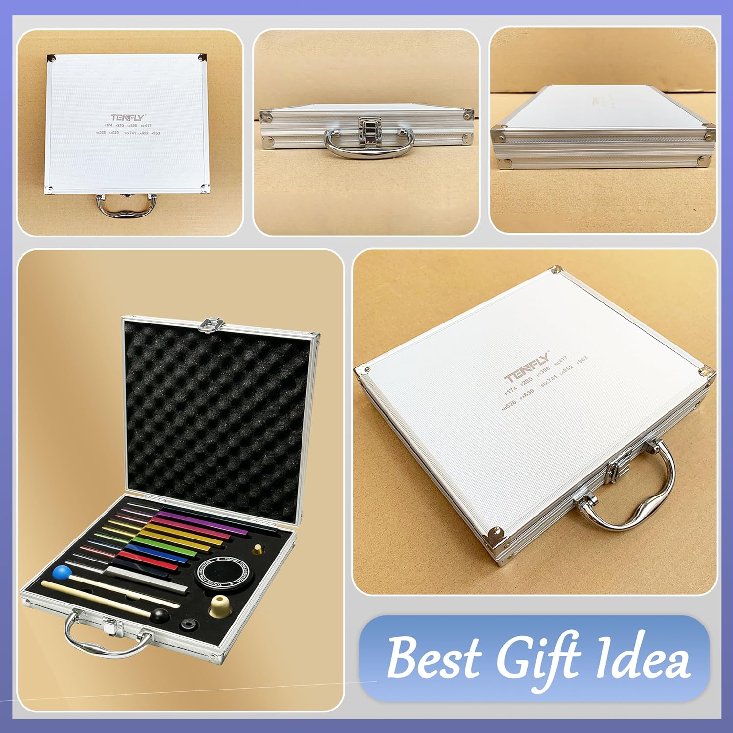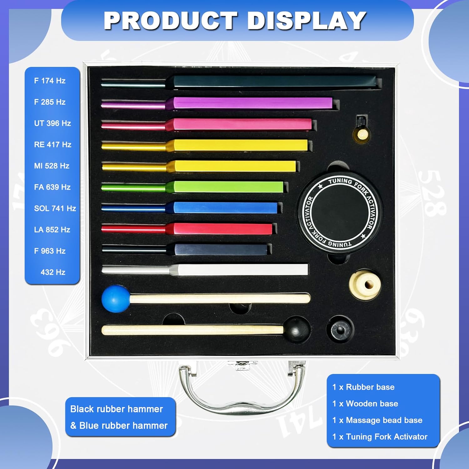What You Get:Solfeggio Tuning Fork Set included 174 Hz, 285 Hz, 396 Hz, 417 Hz, 528 Hz, 639 Hz, 741 Hz, 852 Hz, 963 Hz, 432Hz, tuning fork activator, 3 x base, 2 x silicone hammer, cleaning cloth and a exquisite aluminum gift box.