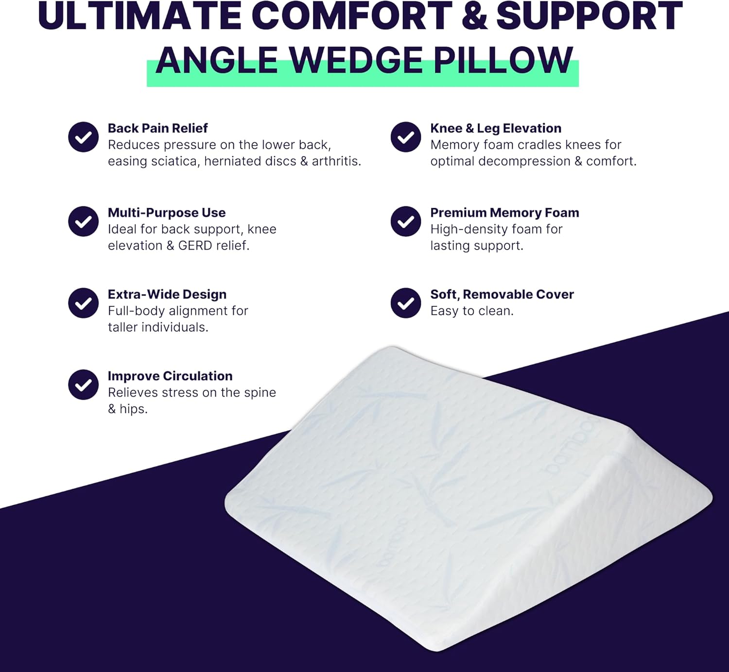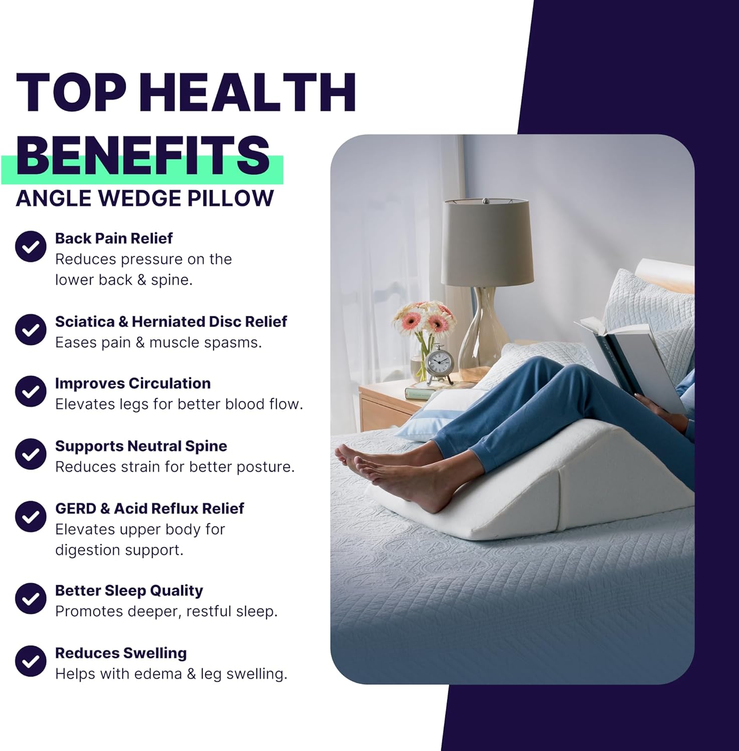 BED WEDGE PILLOW FOR SLEEPING – This wedge pillow for knee pain relief and back support is designed to take pressure off your lower back and reduce pain caused by sciatica, herniated or bulging disc, arthritis, edema, phlebitis, muscle spasms, stress, and more.