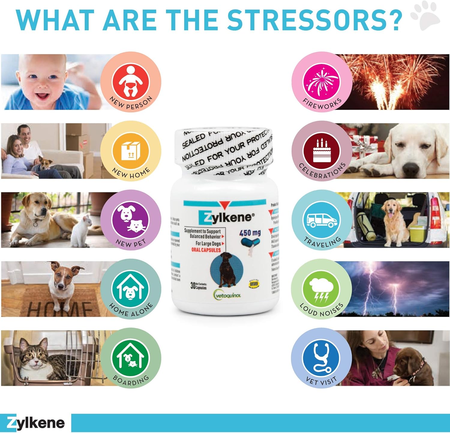 Help Your Pet Cope With External Stress – Zylkene helps your pet cope with changes in their daily routine, such as travel, celebrations, vet visits, home alone, boarding, loud noises, and more