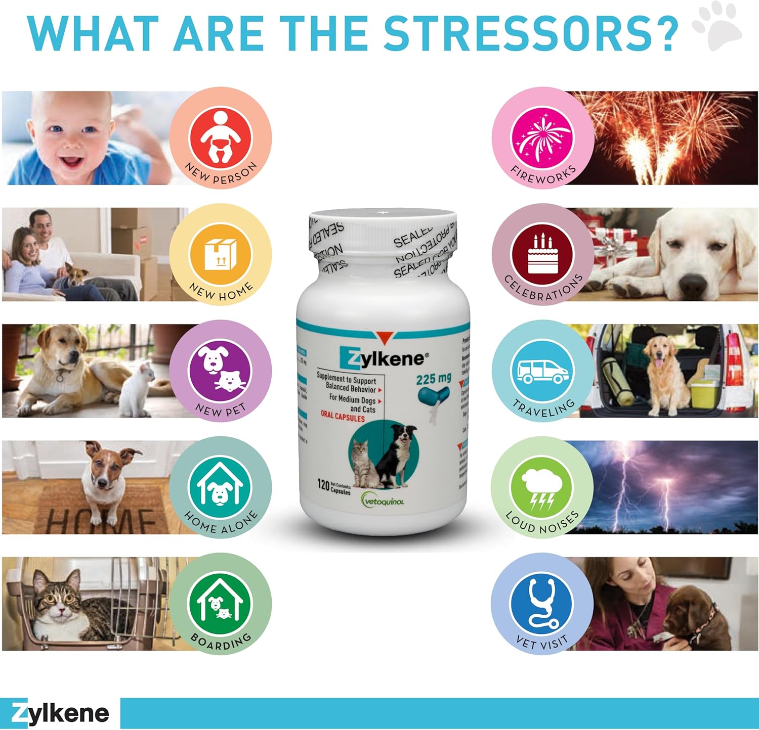 Help Your Pet Cope With External Stress – Zylkene helps your pet cope with changes in their daily routine, such as travel, celebrations, vet visits, home alone, boarding, loud noises, and more