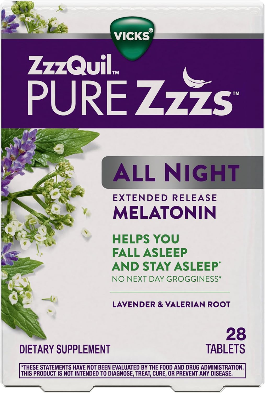 ZzzQuil PURE Zzzs All Night extended release melatonin tablets work naturally with your body to help you stay asleep longer though the night.* These bi-layer melatonin tablets are designed to slowly release for up to 6 hours to help you fall asleep and stay asleep longer through the night.* The immediate release melatonin layer helps you fall asleep naturally, and the extended release melatonin layer helps you stay asleep longer.* If you’ve been having occasional sleeplessness, whether it’s caused by changes in your schedule, stress or just restless thoughts, you may be considering adding a melatonin sleep aid to your nighttime routine as a solution. These drug-free, non-habit forming sleep aids work naturally with your body to support sleep and are specially formulated with 2mg melatonin, shown to help regulate your sleep cycle without next day grogginess*. They also include a complementary blend of botanicals including chamomile, lavender, lemon balm, and valerian root. ZzzQuil PURE Zzzs was developed by the trusted experts at Vicks, because everyone deserves a great night’s sleep. ZzzQuil is the World’s #1 Sleep Aid Brand!† *These statements have not been evaluated by the Food and Drug Administration. This product is not intended to diagnose, treat, cure, or prevent any disease. †Source Euromonitor International Limited; Consumer Health 2024 Edition; Sleep Aids, all channels, retail selling price, Global Brand Name ZzzQuil 2023 data