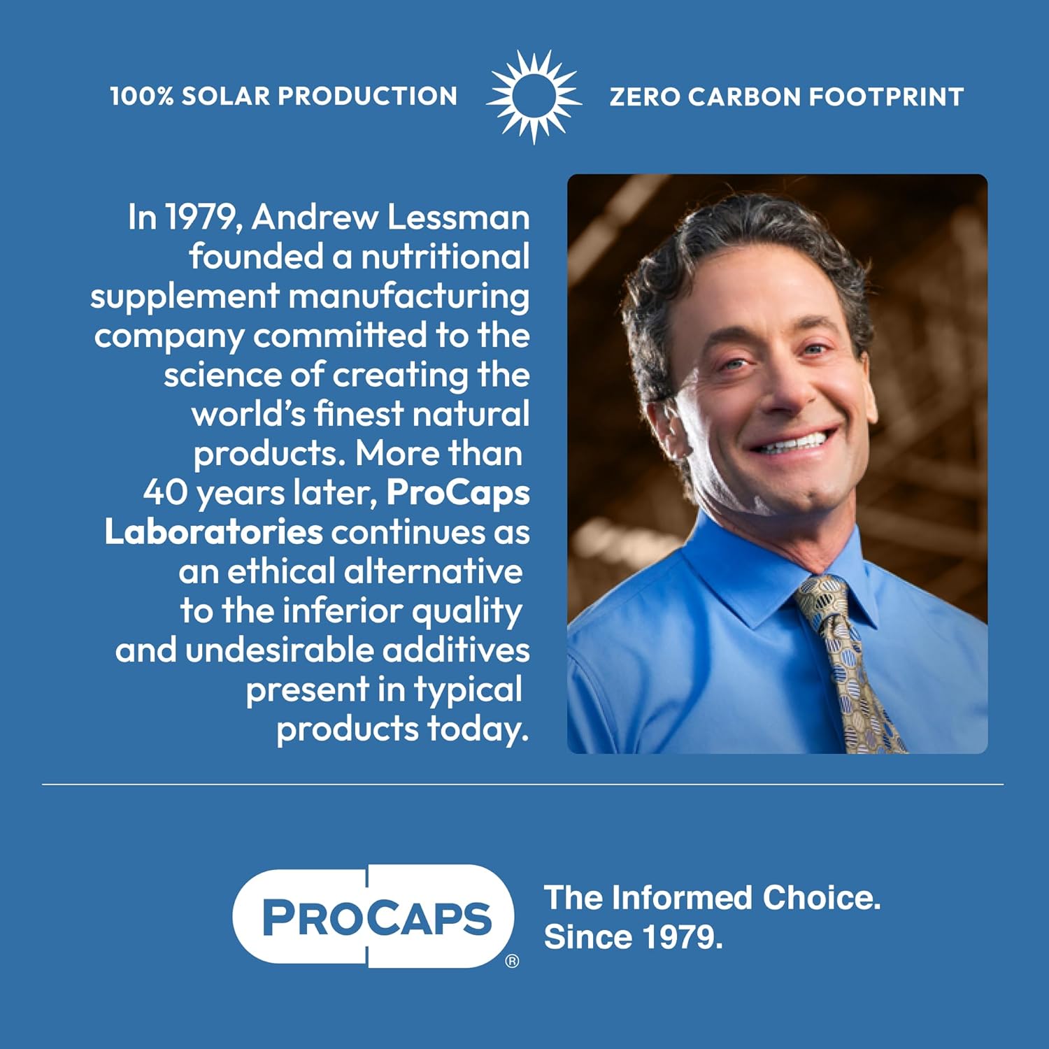Ethical & Eco-friendly. Zero Carbon Footprint – Uniquely committed to your health and the health of the planet, ProCaps’ facilities are 100% Solar Powered with a Zero Carbon Footprint and an LEED Gold green building status. All ProCaps bottles are made from 100% recyclable post-consumer resin. Plus, Andrew Lessman and ProCaps are the largest donor of prenatal vitamins in the world (over 2 billion capsules donated to date). ProCaps, the Informed Choice for Nutritional Supplements.