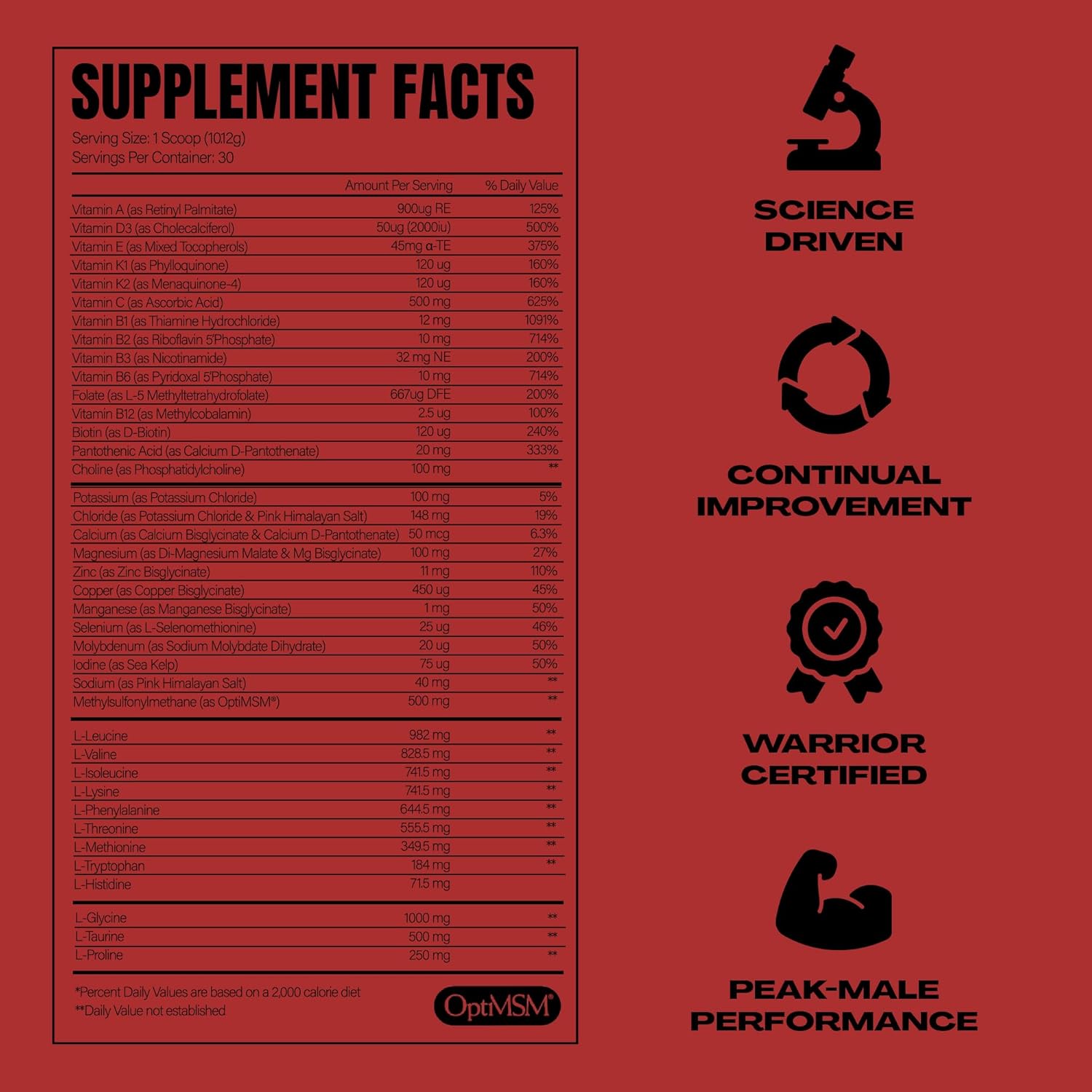 ALL-IN-ONE FORMULA. Every sip of Fireblood delivers a comprehensive blend of essential nutrients, meticulously selected to fuel your journey towards peak physical and mental performance. NO ADDITIVES, PURE QUALITY. We’ve stripped away the unnecessary, and sourced the finest ingredients. Delivering a potent, robust and uncompromising supplement to support your physical and mental health. CRAFTED FOR THE WINNERS. Vitamin A (as Retinyl Palmitate) 900ug RE 125% Vitamin D3 50ug (4000iu) 1000% Vitamin E (as D-Alpha Tocopherol and Mixed Tocopherols: D-Beta, D-Gamma and D-Delta Tocopherol) 45mg a-TE 375% Vitamin K1 (as Phylloquinone) 120ug 160% Vitamin K2 (as Menaquinone-4)120ug 160% Vitamin C 500mg 625% Vitamin B1 (as Thiamine Hydrochloride)12mg 1091% Vitamin B2 (as Riboflavin 5’Phosphate)10mg 714% Vitamin B3 (as Nicotinamide) 32mg NE 200% Vitamin B6 (as Pyridoxine 5’Phosphate)10mg 714% Folate (as L-5 Methy|tetrahydrofolate)667ug DFE 200% Vitamin B12 (as Methylcobalamin)2.5ug 100% Biotin (as D-Biotin)120ug 240% Pantothenic Acid (as Calcium D-Pantothenate) 20mg 333% Choline (as Phosphatidy|choline)100mg**Potassium (as Potassium Chloride)100mg 5% Chloride (as Potassium Chloride and Pink Himalayan Salt) 19% Calcium (as Calcium Bisglycinate and Calcium D-Pantothenate)50mg 6.3% Magnesium (as Di-Magnesium Malate and Magnesium Bisglycinate)100mg 27% Zinc (as Zinc Bisglycinate) 11mg 110% Copper (as Copper Bisglycinate)450ug 45% Manganese (as Manganese Bisglycinate) 1mg 50% Selenium (as L-Selenomethionine)25ug 46% Molybdenum (as Sodium Molybdate Dihydrate) 20ug 50% lodine (as Sea Kelp)75ug 50% Sodium (as Pink Himalayan Salt) 40mg**Methylsulfonymethane (as OptiMSM)500mg**L-Leucine982mg L-Valine828.5mg L-Isoleucine741.5mg L-Lysine714.5mg L-Phenylalanine644.5mg L-Threonine555.5mg L-Methionine349.5mg L-Tryptophan184mg L-Histidine71.5mg L-Glycine1000mg L-Taurine500mg L-Proline250mg *Percent Daily Values are based on a 2,000 calorie diet.