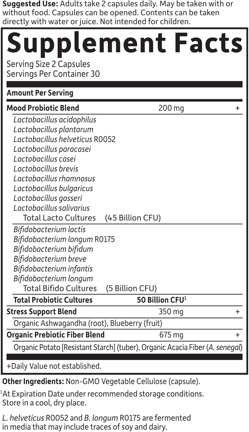 Dr. Formulated Probiotics Mood is a unique probiotic formula with clinically studied strains to support mood and includes organic ashwagandha and organic Alaskan blueberries—all in just 2 capsules a day †. Emerging science is showing a link between gut and brain health. Dr. Perlmutter created this unique formula with 16 probiotic strains including clinically studied probiotics L. helveticus R0052 and B. longum R0175 in the amounts clinically shown to support mood and relaxation.† Mood plus probiotics for women and men also have 350mg of organic ashwagandha and organic Alaskan blueberries. Shelf stable, no need to refrigerate.