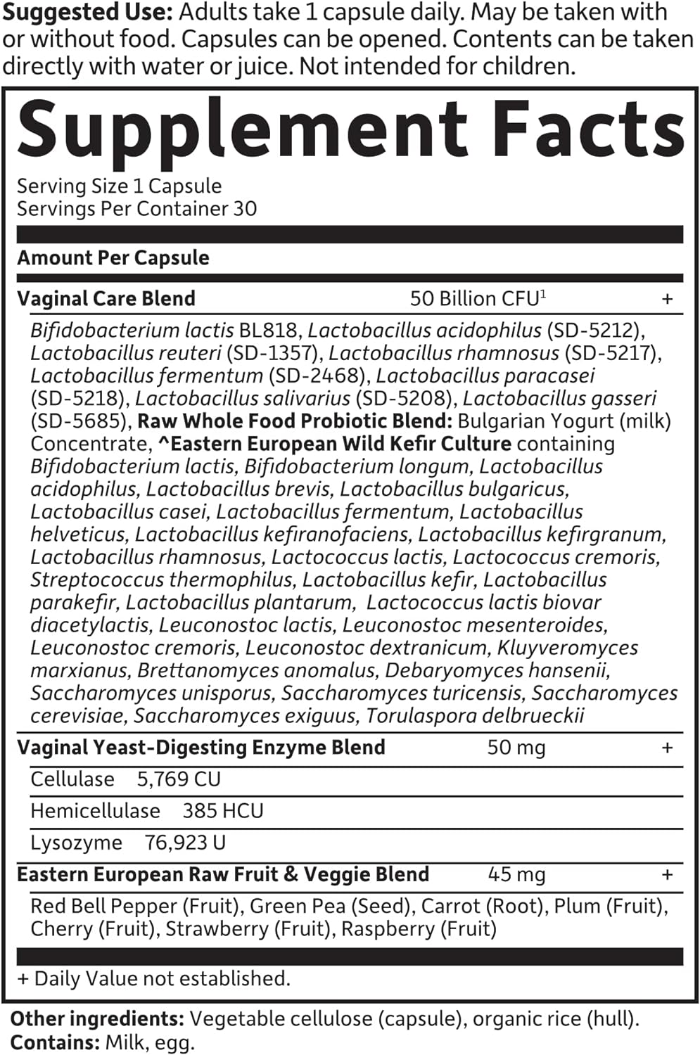 IMMUNE SUPPORT: 50 billion CFU and 38 probiotic strains harvested directly from Bulgarian yogurt and Eastern European wild kefir, Yeast-Digesting Enzymes such as Cellulase and Fruits and Veggies, to support vaginal flora balance and urinary tract health