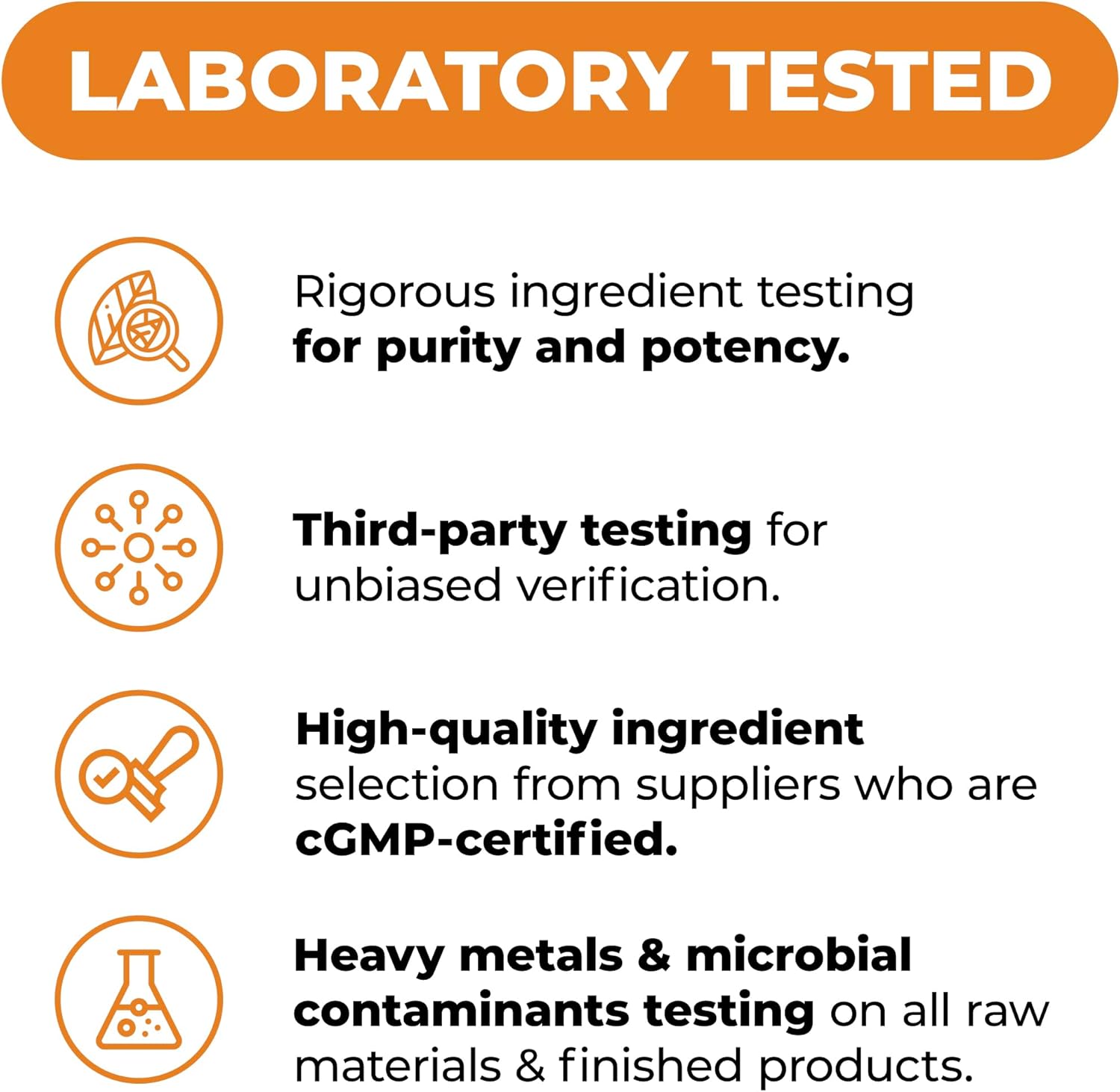 We conduct thorough quality tests during production to ensure each product’s purity and potency. Ingredients are chosen only from suppliers adhering to Stringent Industry Standards and cGMP.