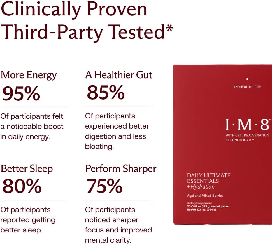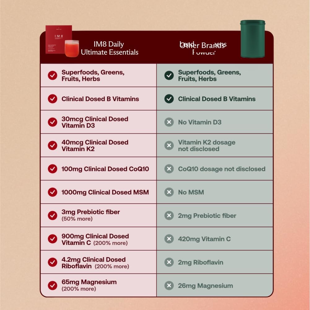 DAILY ULTIMATE ESSENTIALS: Your daily foundation for energy, focus, digestion, and whole-body wellness support—in one delicious and easy-to-mix drink. IM8 Daily Ultimate Essentials is a science-backed, all-in-one supplement for men and women designed to simplify daily nutrition with a science-backed formula. With 92 nutrient-rich ingredients, including essential vitamins, minerals, superfoods, and clinically studied doses of CoQ10 and MSM, IM8 supports hydration, digestion, energy metabolism, immune function, and overall well-being, including key nutrients for hair, skin, nails, joints, muscles, and heart health.