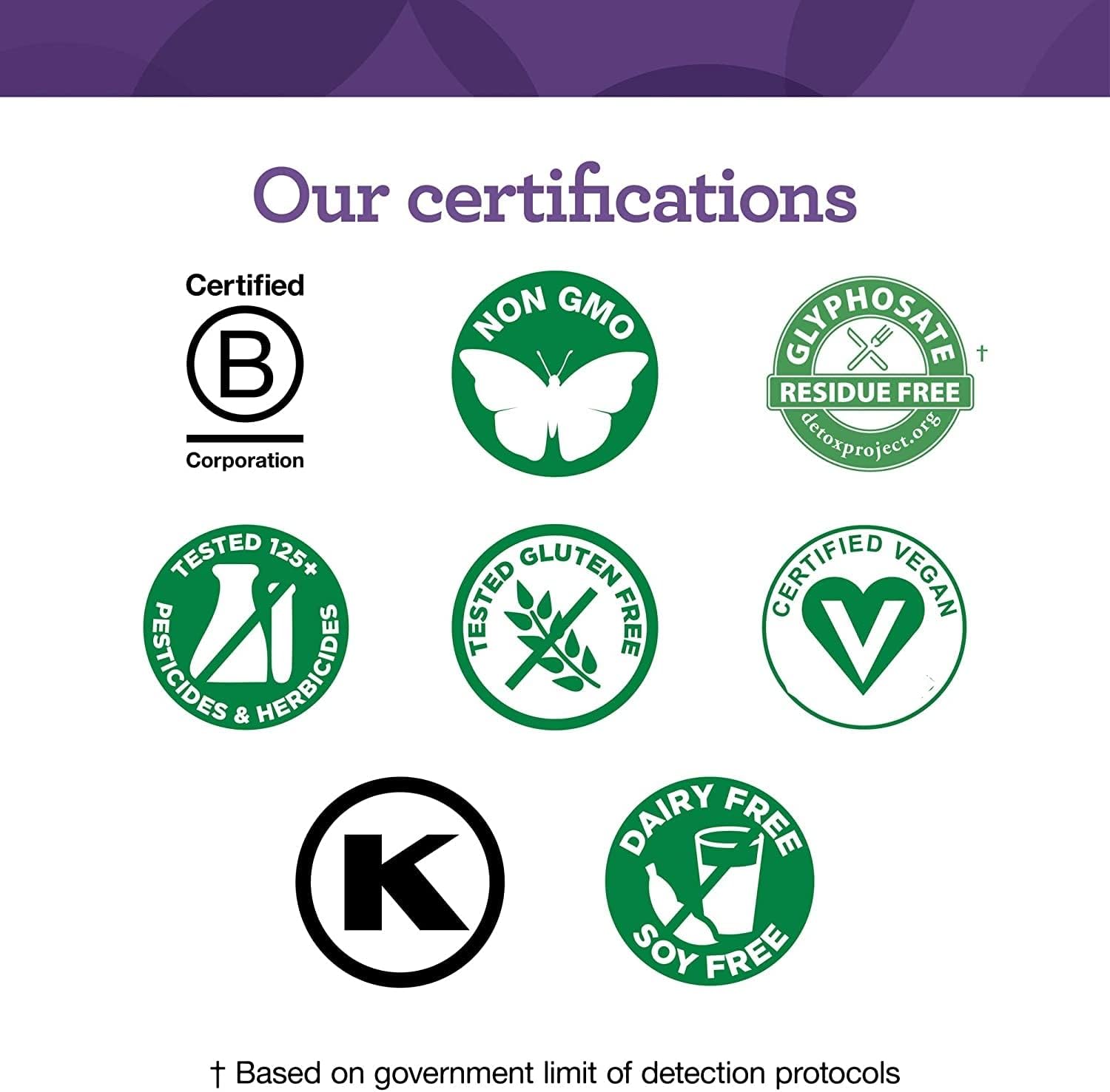 Put To The Test: Non-GMO; Certified B Corp; Certified Kosher; Tested for over 125 chemical substances; Free of gluten, dairy and soy