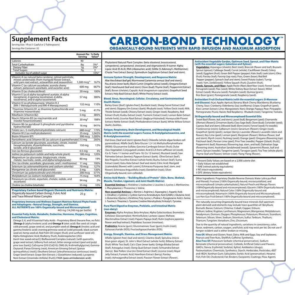 Enhanced Absorption & Bioavailability: This Organically-bound, all-natural formula features our proprietary Carbon-Bond Technology (CBT), enabling rapid infusion and maximum absorption of over 415 Organically-bound nutrients at the cellular level in under 18 seconds.