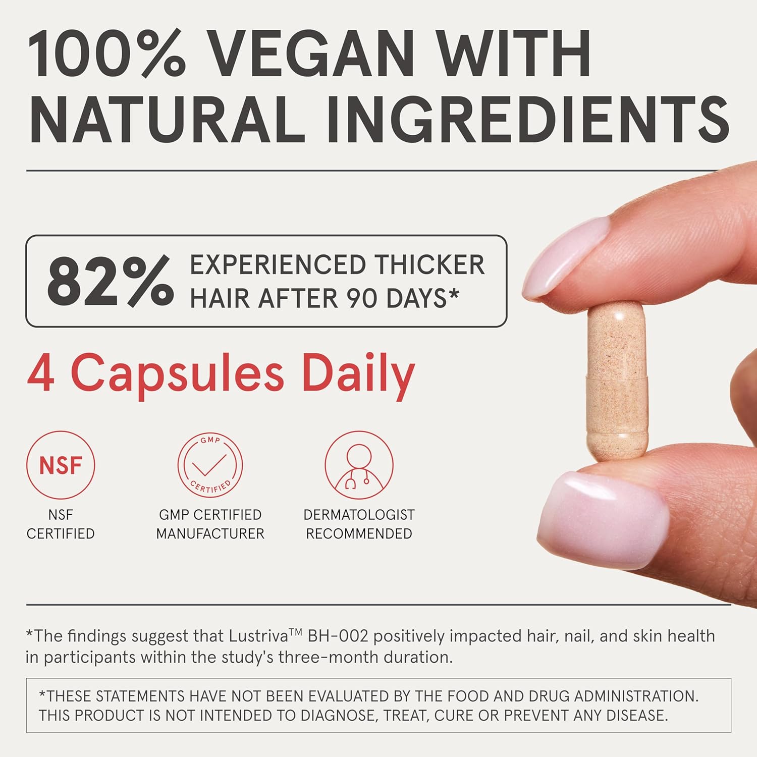 Rapid Results with Lustriva: Achieve noticeable improvements in hair health after just one bottle of our advanced hair growth supplement. The potent effects of Lustriva rapidly kickstart hair revitalization, restoring volume and thickness to thinning hair faster than ever