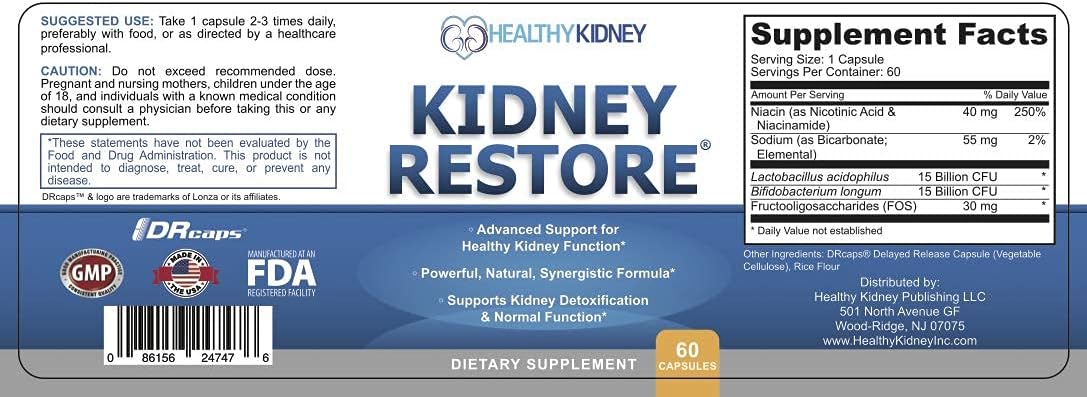 The Probiotic microorganisms & FOS support kidneys by supporting natural elimination of bad stuff in the gut; this supports kidney health by allowing them to work less and rest. The delayed release sodium bicarb neutralizes renal acids and body junk, balances minerals and so much more. This is the most complete kidney supplement out there. Niacin to support phosphorus levels & heart health. Let Kidney Restore support your kidneys!