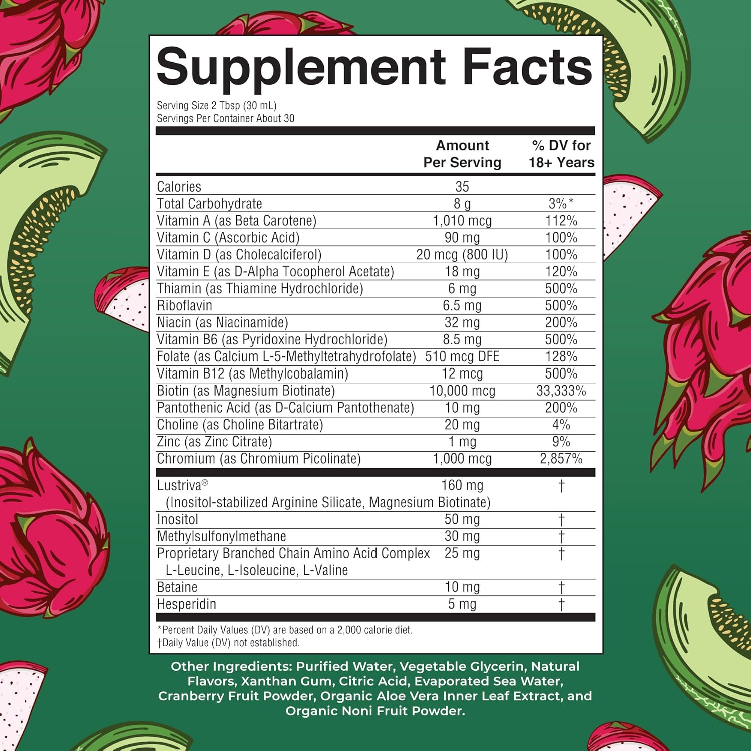 WOMEN HAIR GROWTH SUPPLEMENT: Enjoy this delicious liquid multivitamin in a peach mango or dragon fruit melon flavor and receive all of these nutrients plus Lustriva for thicker, fuller hair in women with just two tablespoons per day!