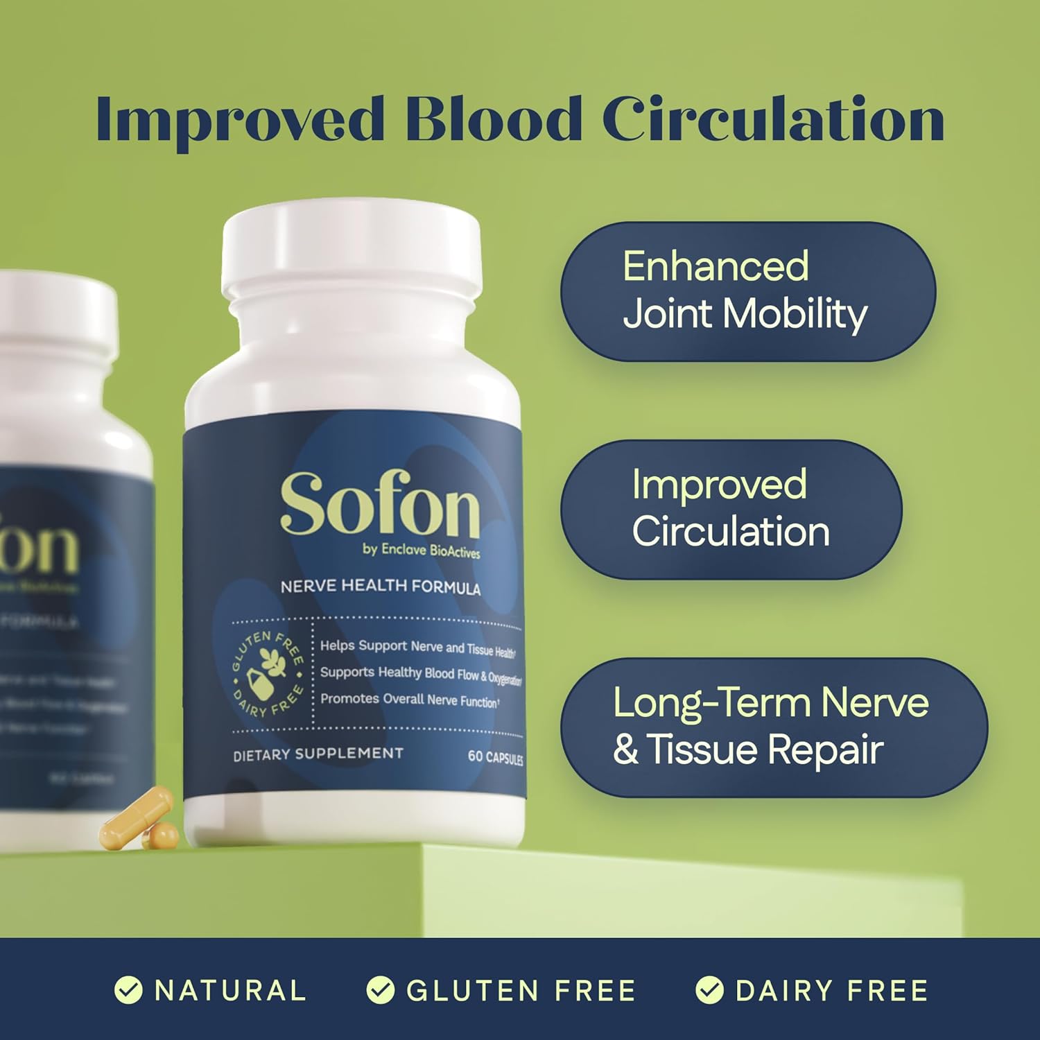 Blood Circulation The Natural Way: Rich in MSM and Bromelain, known to impact oxygenation & blood circulation, Sofon is your ally in maintaining excellent circulation for maximum sciatica relief benefits.