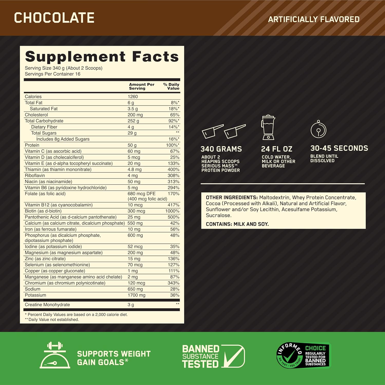 Optimum Nutrition Serious Mass, Weight Gainer Protein Powder, Mass Gainer, Vitamin C and Zinc for Immune Support, Creatine, Chocolate, 12 Pound (Packaging May Vary)