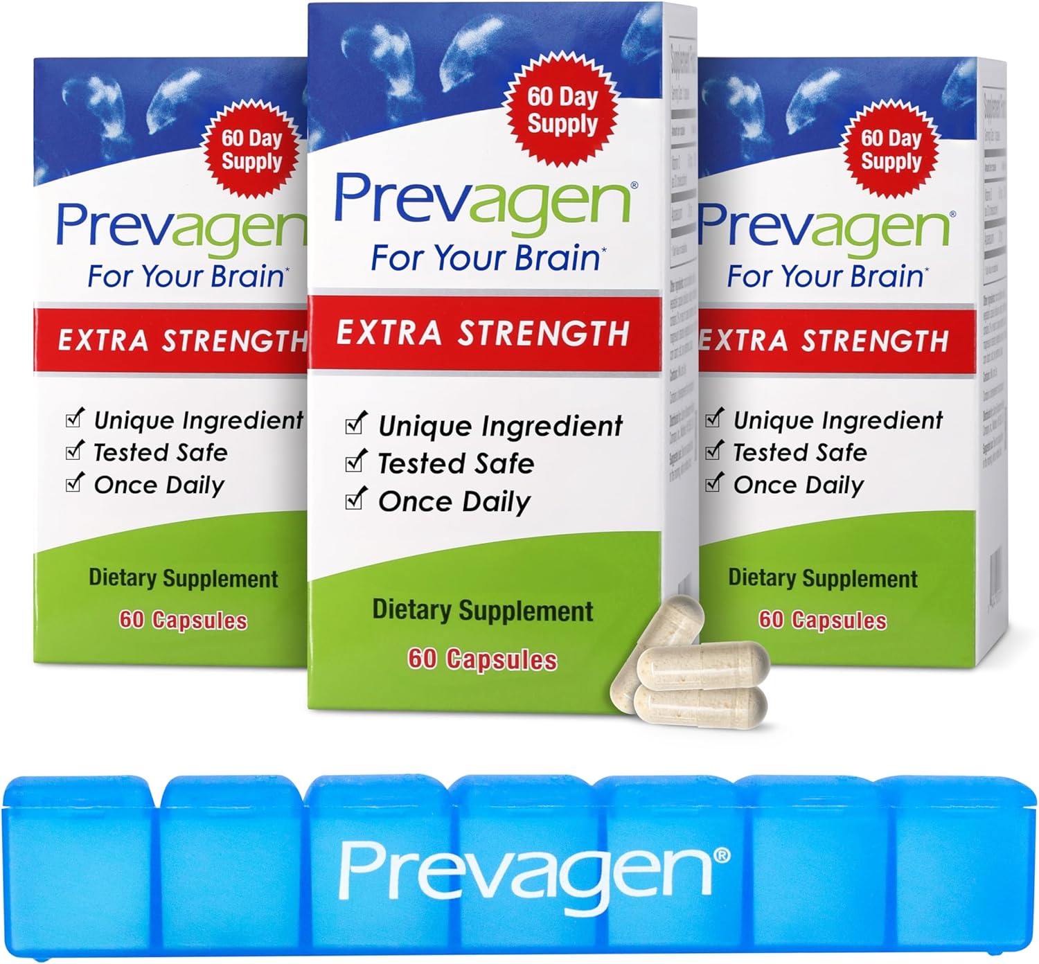Prevagen Extra Strength 20mg, 60 Capsules |3 Pack| with Apoaequorin & Vitamin D and 7-Day Pill Minder