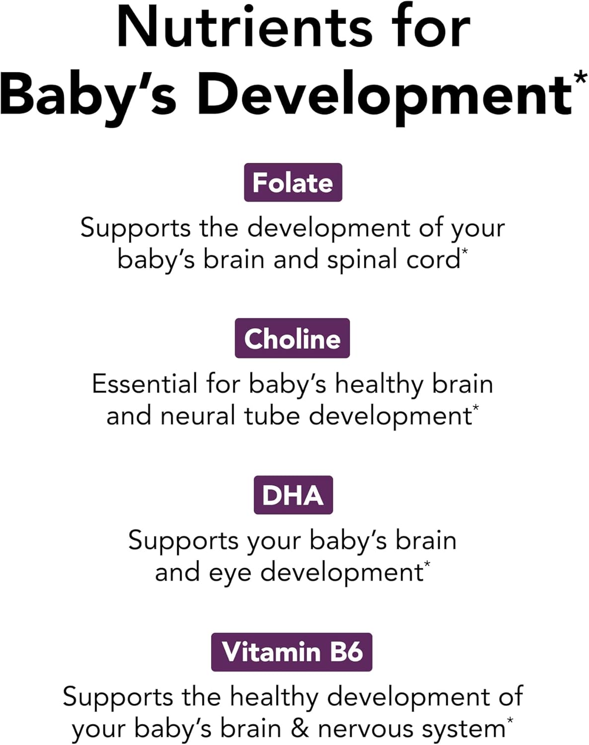 Comprehensive Formula: 1 softgel and 2 tablets a day provide our most comprehensive formula for baby and mom, including 250 mg of choline, folate, and 300 mg of DHA to support your baby’s brain development*