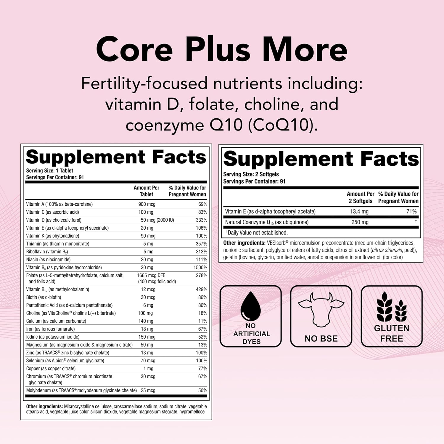 Fertility Support Pills: This comprehensive women’s multivitamin also includes vitamin A (beta carotene), C, D3, and other essential nutrients for preconception health*